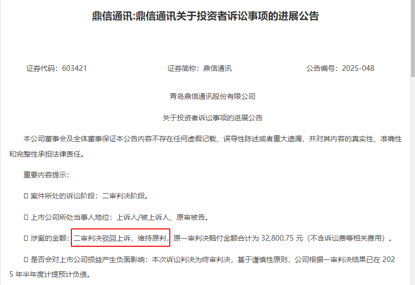 据了解,青岛鼎信通讯(603421)2025年9月披露二审判决,法院驳回上诉维持原判,公司需赔付投资者32,800.75元。该案源于公司未及时披露生产经营重大变化及控股股东股份处分情况。郑律师表示,2024年2月27日至3月29日(含当日)买入,并在3月30日后卖出或持有该股票的受损投资者可加入索赔。值得注意的是,截至2025年11月10日,公司股东户数已降至3.08万户,较上月减少1.51%。