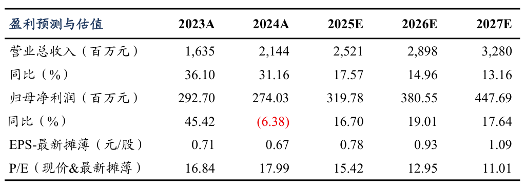 事件:2024年,公司全年实现营业收入21.44亿元(+31.16%,同比增长31.16%,下同),主要系公司销售增长及合并范围变化所致,归母净利润2.74亿元(-6.38%),扣非归母净利润2.68亿元(+9.08%)。单Q4季度,公司营收6.97亿元(+4.78%),归母净利润0.8亿元(-40.70%),扣非归母净利润0.81亿元(-12.56%)。2025年Q1,公司实现营业收入4.09亿元(-3.18%),归母净利润0.42亿元(-25.16%),扣非归母净利润0.39亿元(-31.56%)。短期业绩有所承压。
