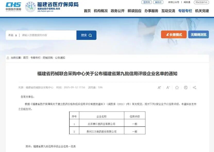 去年9月,福建省医疗保障局发布《关于公布福建省第九批信用评级企业名单的通知》,其中,对三力制药予以信用评级,评定为“一般”失信。