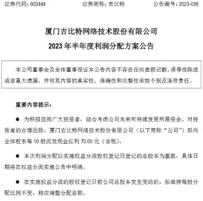 吉比特公告,综合考虑公司未来可持续发展所需资金、对投资者的合理回报,拟向全体股东每10股派发现金红利70.00元(含税),合计拟派发现金红利约5.04亿元(含税)。这也就意味着,此次半年度分红占公司当期净利润的约75%。