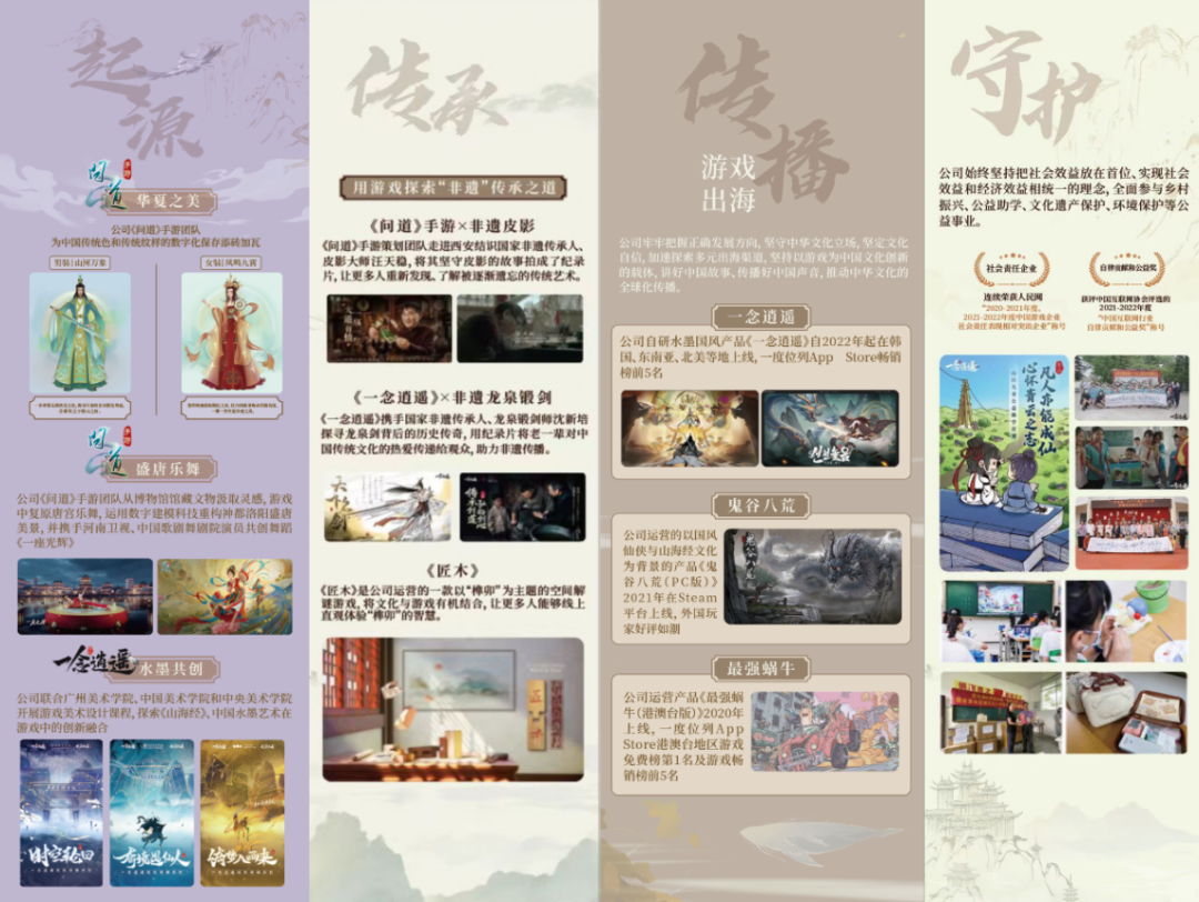 公司始终坚持正确导向,积极履行文化企业社会责任,运用数字技术,将非物质文化遗产等中华优秀传统文化植入游戏,使产品兼具审美和人文价值;加速境外布局,立体推动中华文化“走出去”,提升中国文化产业国际影响力竞争力;培育新型业态,将游戏IP与文学、音乐、影视等相融合,延长数字文化产业链供应链创新链,提升数字文化产品附加值。