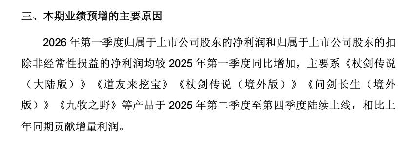 关于业绩变动,吉比特表示,2026年第一季度归属于上市公司股东的净利润和归属于上市公司股东的扣除非经常性损益的净利润均较2025年第一季度同比增加,主要系《杖剑传说(大陆版)》《道友来挖宝》《杖剑传说(境外版)》《问剑长生(境外版)》《九牧之野》等产品于2025年第二季度至第四季度陆续上线,相比上年同期贡献增量利润。