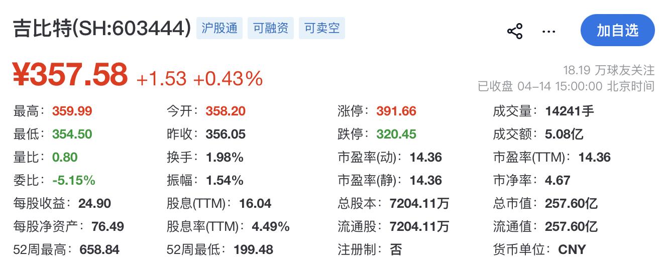 截至发稿时,吉比特报357.58元,涨0.43%,总市值约257.60亿元。