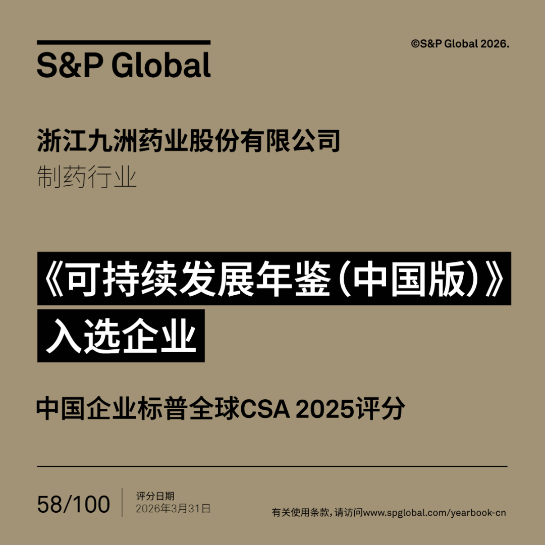 近日,标普全球(S&P Global)正式发布《可持续发展年鉴(中国版)2026》(Sustainability Yearbook 2026),九洲药业入选该年鉴。