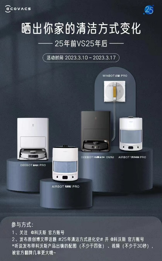 近日,由科沃斯发起的“25年清洁方式进化史”征集活动完美收官。结合周年庆主题“携手二十五载·共赴星辰大海“,科沃斯积极邀请用户参与,分享25年来家中清洁方式迭代的故事,共同畅想未来家用机器人的美好改变。