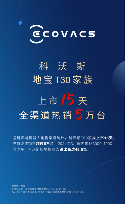 科沃斯地宝T30系列,作为当前市场上畅销的扫拖产品之一,延续了T系列一贯的热销传统。自上市15天以来,便在全渠道实现了超过5万台的惊人销量。截至2024年3月,在国内市场3000-4000元价位段,科沃斯(603486)扫地机器人的销售占比已高达48.5%。这一市场表现的火爆,反映了消费者对科沃斯品牌实力和产品技术的广泛认可。4月15日,科沃斯再接再厉,推出了地宝T30 MIX、T30 MIX PRO及T30 MIX COMBO三款新型号。其中,地宝T30 MIX和T30 MIX PRO为单体全能扫拖机器人,而T30 MIX COMBO则是集扫拖机器人与手持吸尘器于一体的1+5+N全场景清洁解决方案的“清洁中心”。T30 MIX系列的多项创新功能,再度为家庭提供一站式清洁的新解决方案。