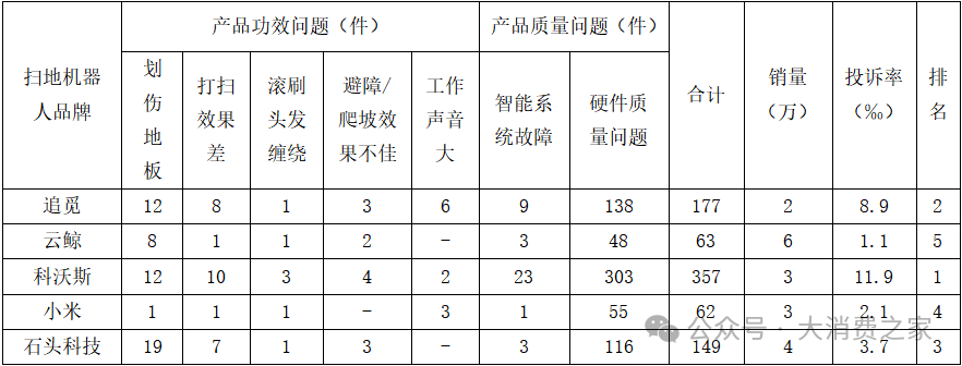 大消费之家一方面查询黑猫投诉中,五大品牌扫地机器人从2024年以来的投诉,过滤掉服务投诉,仅筛选质量问题相关的投诉进行统计;另一方面,由于投诉量和产品销售量挂钩,于是选用扫地机器人品牌淘宝官方旗舰店最畅销扫地机器人单品的月付款量,作为产品销售量的替代指标。结合上述两个方面编制表3。