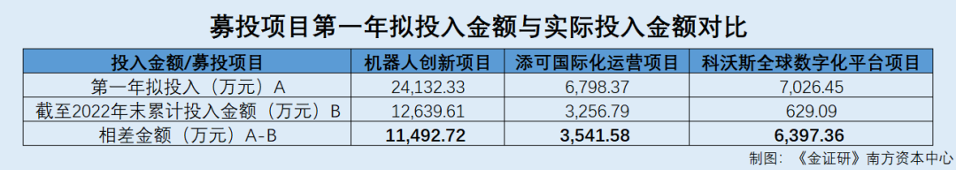然而,据科沃斯2023年4月29日出具的《2022年度募集资金存放与实际使用情况的专项报告》,截至2022年末,机器人创新项目累计投入金额为12,639.61万元,添可国际化运营项目累计投入金额为3,256.79万元,科沃斯全球化数字平台项目累计投入金额为629.09万元。三个项目的项目达到预定可使用状态日期均为2024年12月。