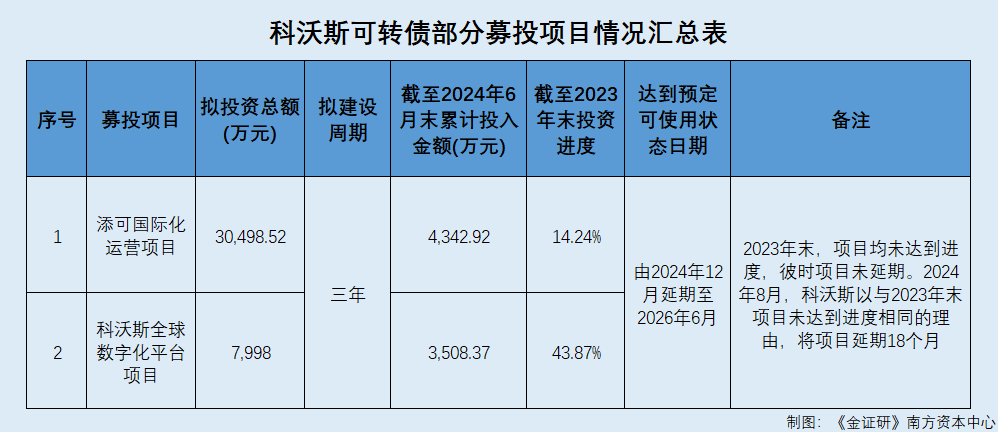 据科沃斯出具日为2024年8月31日的《关于部分募集资金投资项目延期的公告》,2024年8月29日,科沃斯将添可国际化运营项目及科沃斯全球数字化平台项目的建设期均延长18个月,项目达到预定可使用状态日期均由2024年12月调整至2026年6月。