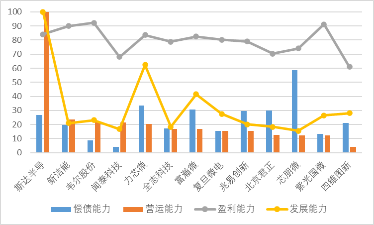 图5 “芯片”赛道企业偿债能力、营运盈利、盈利能力及发展能力(100分制)