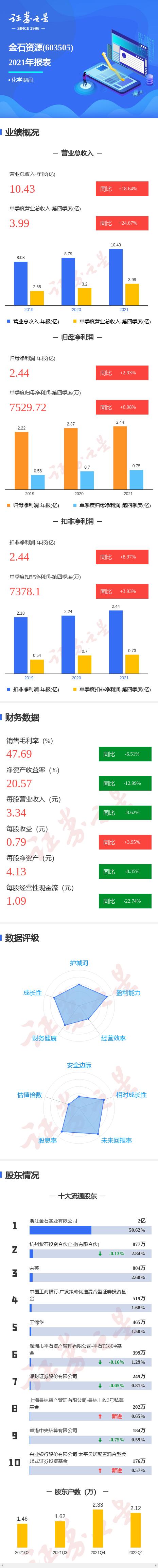 金石资源2021年报显示,公司主营收入10.43亿元,同比上升18.64%;归母净利润2.45亿元,同比上升2.93%;扣非净利润2.45亿元,同比上升8.97%;其中2021年第四季度,公司单季度主营收入3.99亿元,同比上升24.67%;单季度归母净利润7529.73万元,同比上升6.98%;单季度扣非净利润7378.1万元,同比上升3.93%;负债率38.53%,投资收益-317.11万元,财务费用2022.86万元,毛利率47.69%。