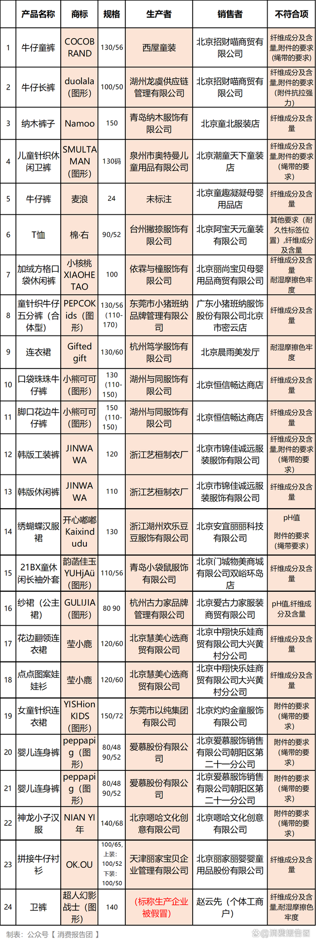 如东莞市小猪班纳品牌管理有限公司生产的PEPCOKids牛仔五分裤、天津丽家宝贝企业管理有限公司生产的OK.OU牛仔衬衫等,检出纤维成分及含量项目不合格。