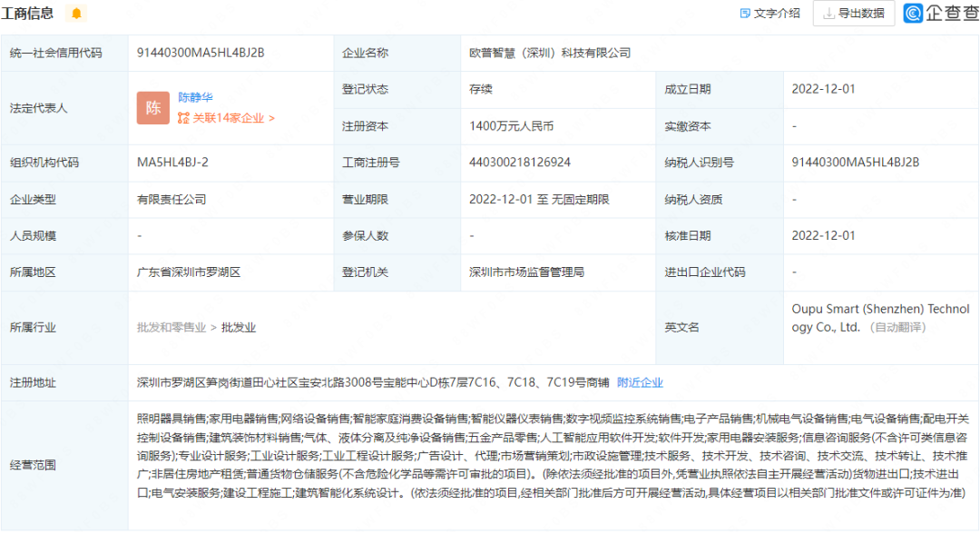 近日,欧普智慧(深圳)科技有限公司于2022年12月1日成立,注册资本1400万人民币,法定代表人为陈静华,欧普照明持有公司股份比例为91%。