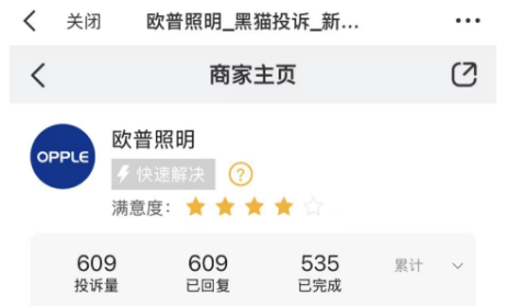 公司的产品问题在消费者端也有所体现。在黑猫投诉平台上,欧普照明的累计投诉量达600多条,投诉问题主要集中在售后服务、产品质量等,而同行佛山照明的累计投诉量为81条。在5月4日最新的投诉中,消费者称在淘宝官方旗舰店购买的风扇灯存在货不对板的问题,且商家态度恶劣,退款问题难解决。