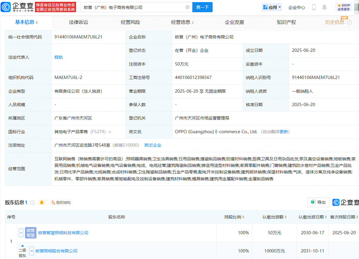 近日,欧普(广州)电子商务有限公司成立,法定代表人为程航,注册资本为50万元,经营范围包含:照明器具销售;卫生洁具销售;日用品销售;搪瓷制品销售;防腐材料销售等。股权穿透显示,该公司由欧普照明(603515)间接全资持股。
