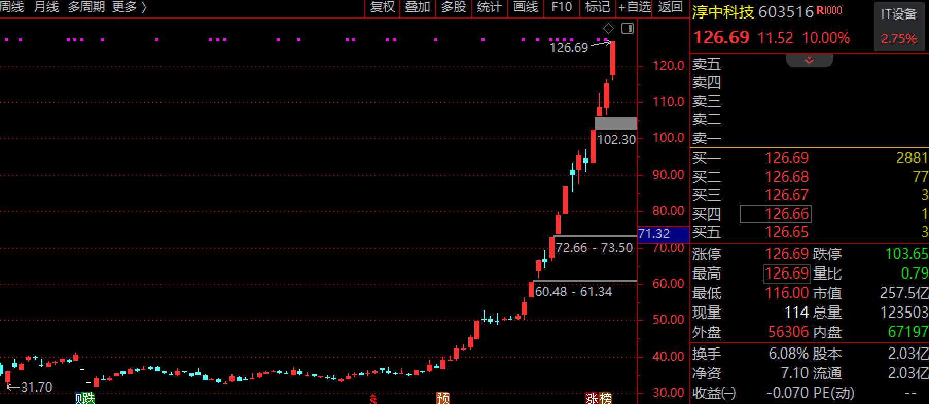 周一,淳中科技继续疯狂之旅,早盘强势涨停,最终收报126.69元,成交额15.30亿元,再度刷新历史新高。