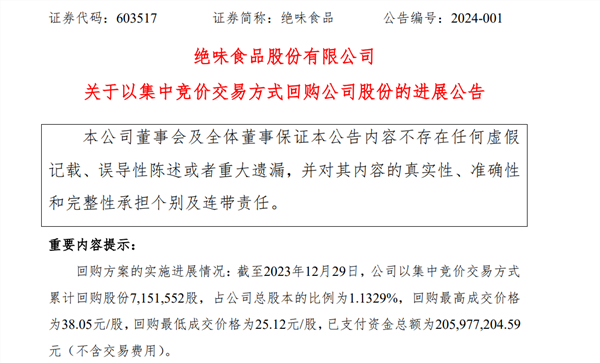 面对持续下跌的股价,绝味食品试图通过回购来提振投资者信心。2024年1月3日,绝味食品发布公告,截至2023年12月29日,公司以集中竞价交易方式累计回购股份7,151,552股,占公司总股本的比例为1.1329%,回购最高成交价格为38.05元/股,回购最低成交价格为25.12元/股,已支付资金总额为205,977,204.59元。