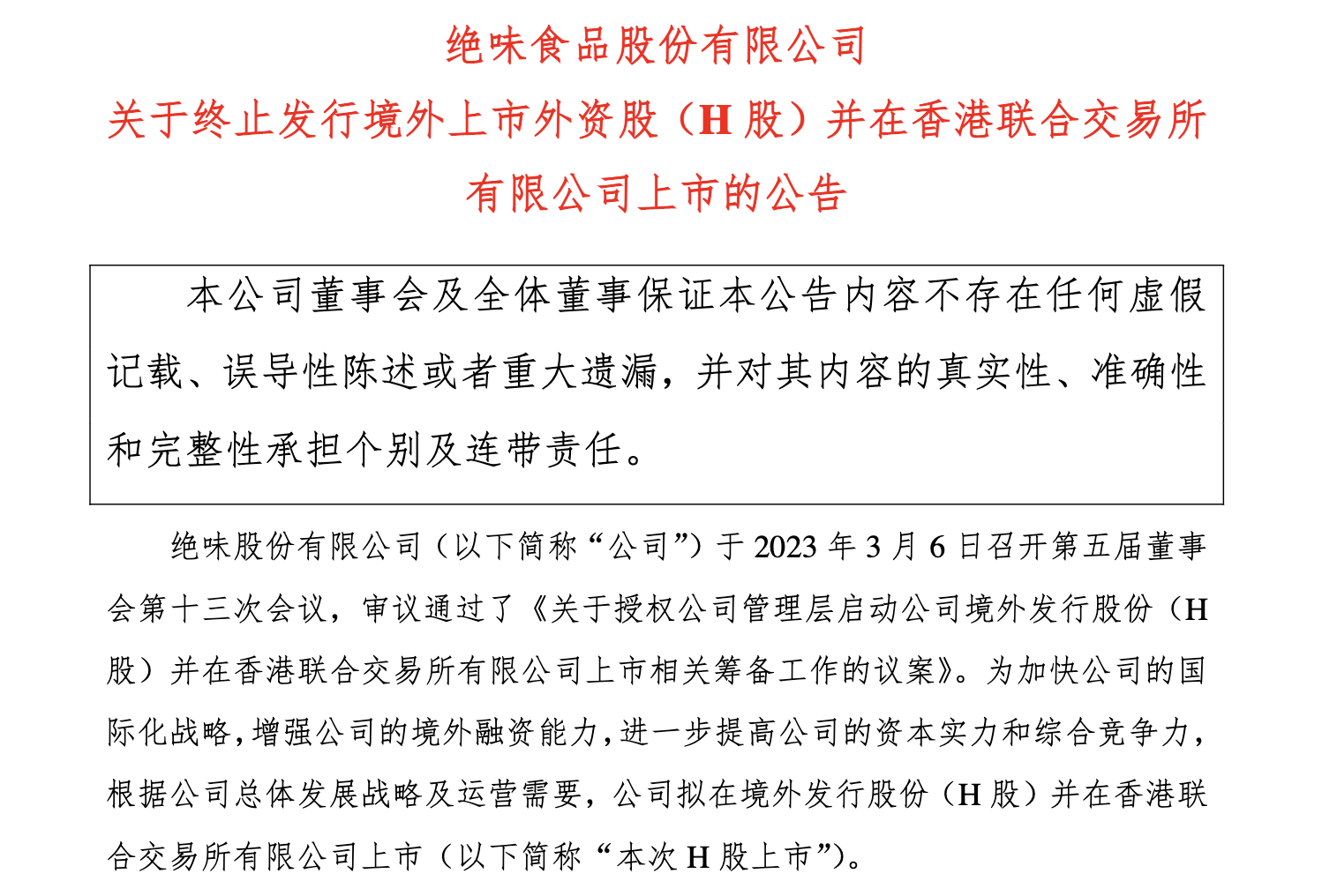 近日,绝味食品发布公告称,由于公司发展战略和经营状况的调整,本着维护股东利益、对股东负责的原则,综合考虑公司目前的实际经营情况、资金需求及业务发展规划,公司决定终止H股发行,谋划了一年多的赴港上市计划宣告终结。