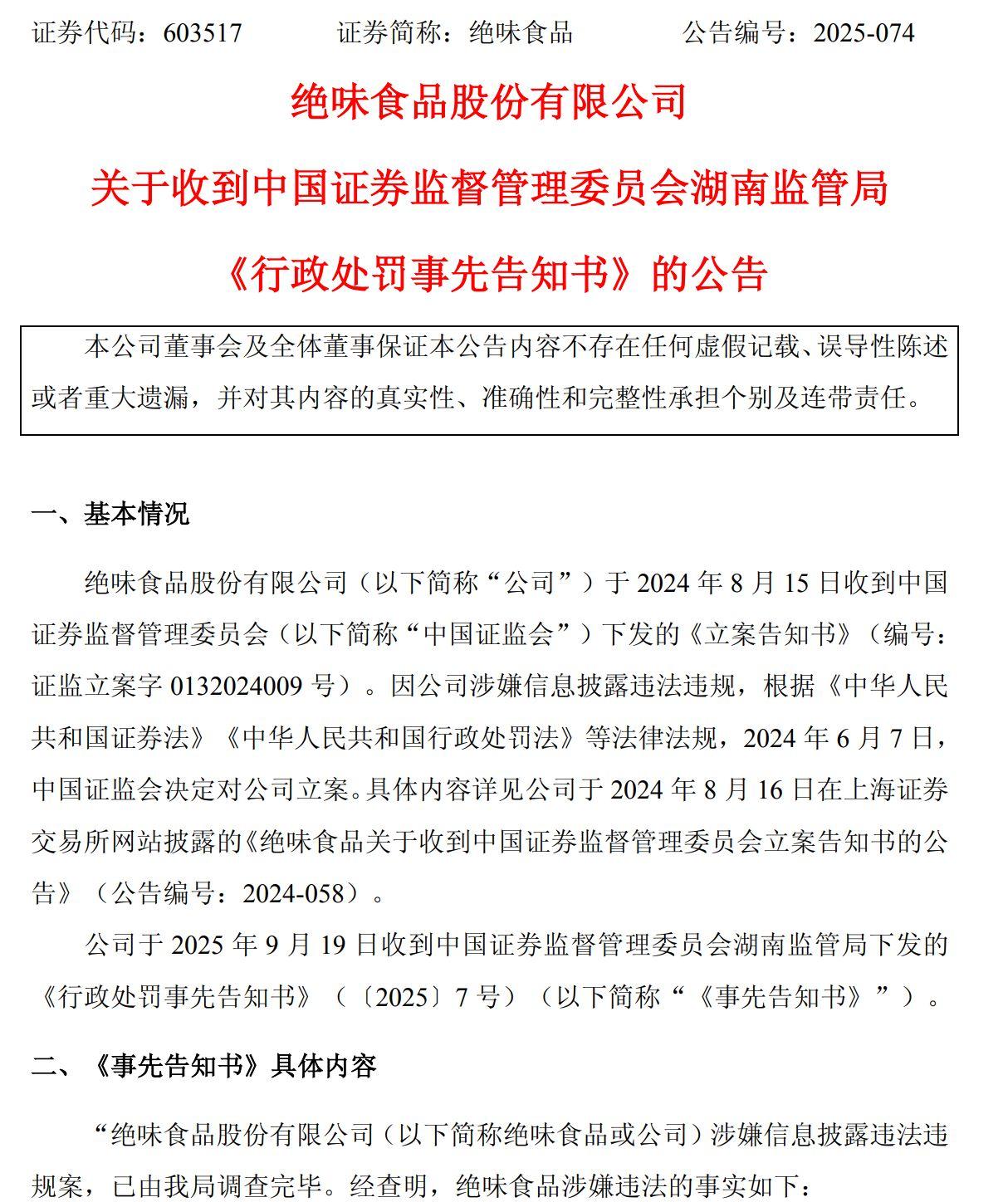 2025年9月19日,绝味食品发布了关于收到中国证券监督管理委员会湖南监管局《行政处罚事先告知书》的公告,打破了资本市场的平静。