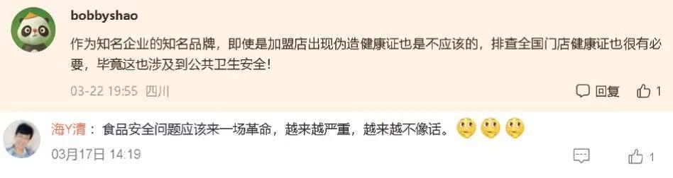 有网友对此评论称:“作为知名企业的知名品牌,即使是加盟店出现伪造健康证也是不应该的,排查全国门店健康证也很有必要,毕竟这也涉及到公共卫生安全。”也有网友感慨道:“食品安全问题应该来一场革命,越来越严重,越来越不像话。”