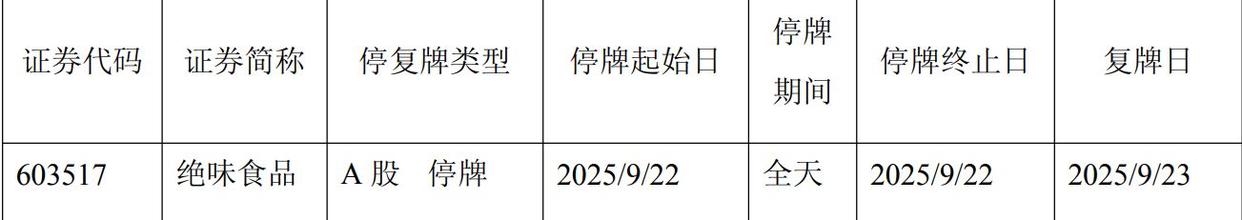 2025年9月22日,绝味食品全天停牌,实施其他风险起始日为2025年9月23日,实施后绝味食品A 股简称为“ST 绝味”。