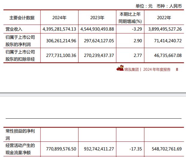 锦泓集团(603518.SH)昨晚发布2024年年报。报告期内,锦泓集团全年实现营业收入43.95亿元,同比下滑3.29%;归属于上市公司股东的净利润3.06亿元,同比增长2.90%;归属于上市公司股东的扣除非经常性损益的净利润2.78亿元,同比增长2.77%;经营活动产生的现金流量净额7.71亿元,同比下滑17.35%。