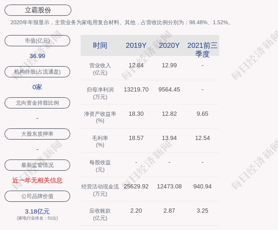 2020年年报显示,立霸股份的主营业务为家电用复合材料、其他,占营收比例分别为:98.48%、1.52%。