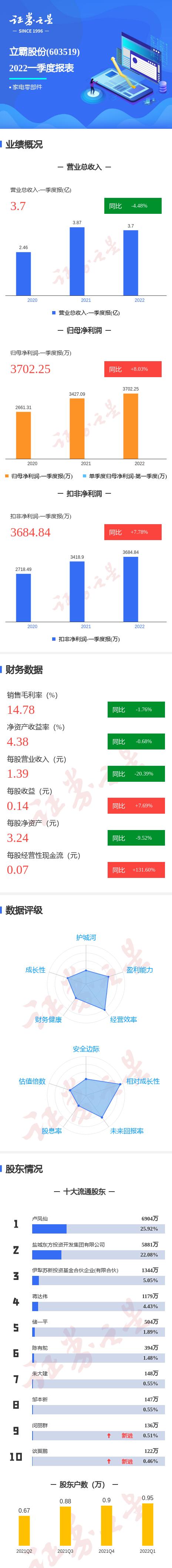 立霸股份2022一季报显示,公司主营收入3.7亿元,同比下降4.48%;归母净利润3702.26万元,同比上升8.03%;扣非净利润3684.84万元,同比上升7.78%;其中2022年第一季度,公司单季度主营收入3.7亿元,同比下降4.48%;单季度归母净利润3702.26万元,同比上升8.03%;单季度扣非净利润3684.84万元,同比上升7.78%;负债率35.17%,投资收益-36.76万元,财务费用56.88万元,毛利率14.78%。
