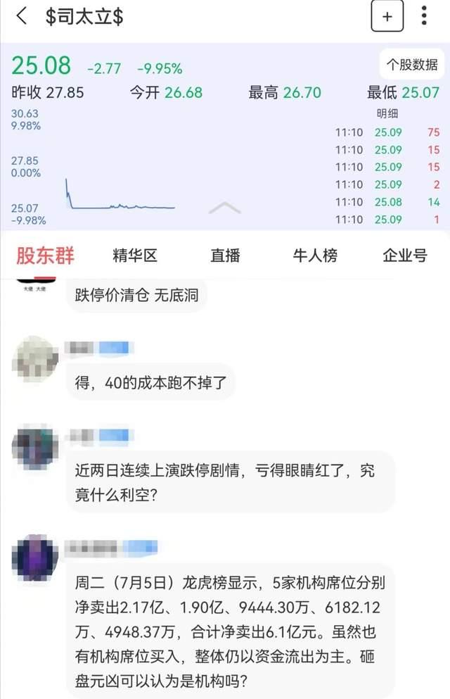 还有投资者表示,“周二(7月5日)龙虎榜显示,5家机构席位分别净卖出2.17亿、1.90亿、9444.30万、6182.12万、4948.37万,合计净卖出6.1亿元。虽然也有机构席位买入,整体仍以资金流出为主。砸盘元凶可以认为是机构吗?”