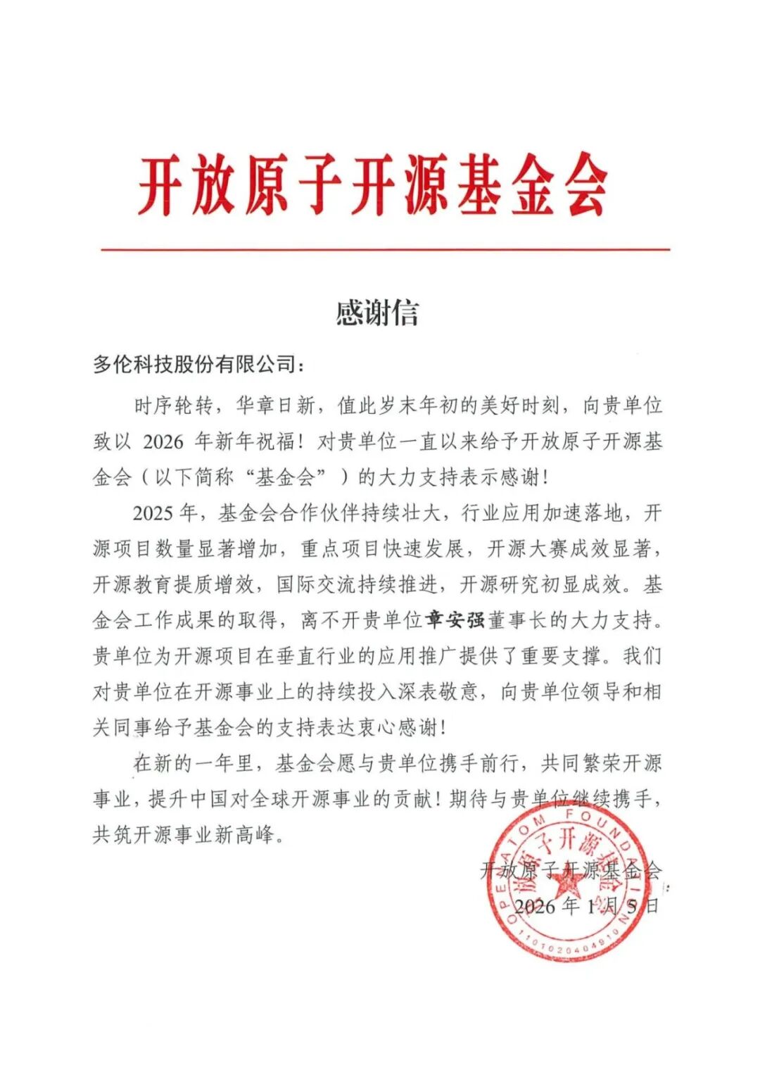2026年1月5日,多伦科技收到了一封来自开放原子开源基金会(以下简称为“开源基金会”)的感谢信,对公司在过去一年中为开源事业发展所做出的积极贡献表示高度认可与衷心感谢。