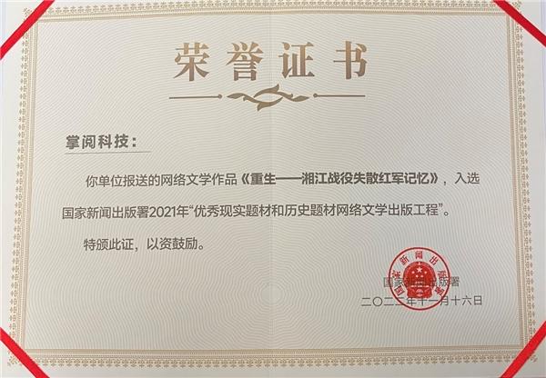 日前,全国重点网络出版企业负责人培训班在四川成都举办,国家新闻出版署在培训班上正式为包括掌阅科技《重生:湘江战役失散红军记忆》等入选2021年“优秀现实题材和历史题材网络文学出版工程”的作品颁发荣誉证书。