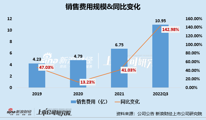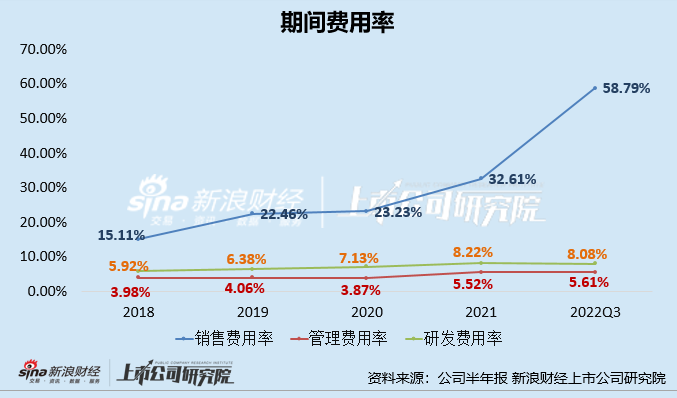 虽然2019年来,公司加大了营销投入,2022年第三季度末销售费用率高达58.79%,但从近年来业务侧和财务侧数据来看,其营销投入成果显然是不及预期的。