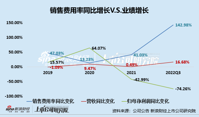 其次,从业绩增量来看,营销支出的大幅提升并未带来营收的同步提升。在2019-2022Q3,公司销售费用分别同比增长47.03%、13.23%、41.03%、142.98%,而同期公司营收仅同比增长-1.09%、9.47%、0.49%、16.68%。