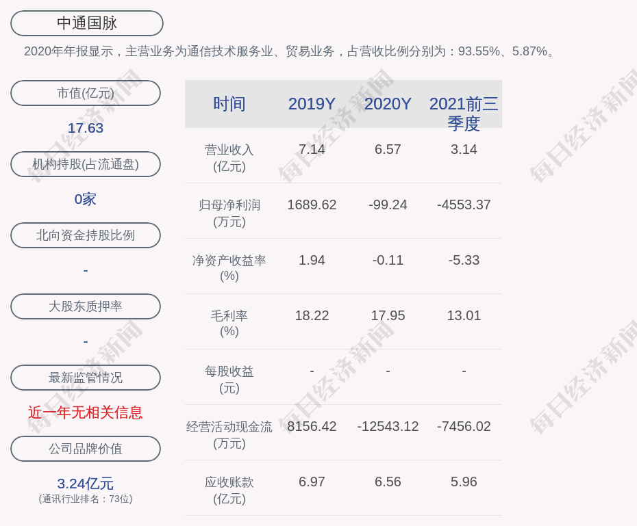 2020年年报显示,中通国脉的主营业务为通信技术服务业、贸易业务,占营收比例分别为:93.55%、5.87%。