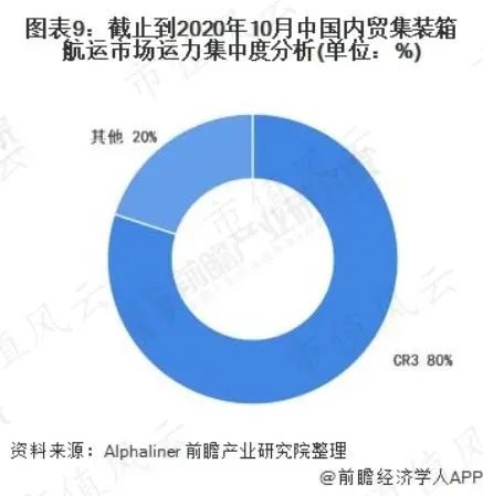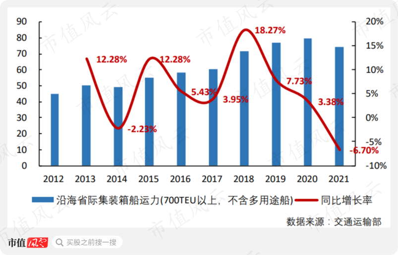 2020年,中远海控(601919.SH,01919.HK)、中谷物流、安通控股(600179.SH)的运力合计占到中国内贸集装箱航运市场的80%。