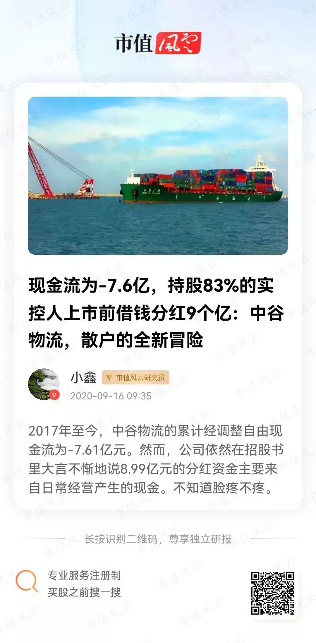 风云君之前曾分析过中谷物流:上市前的2017-2020年上半年,中谷物流累计经调整自由现金流(考虑支付融资租赁的款项)为-7.61亿元,同时期分红却高达8.99亿。