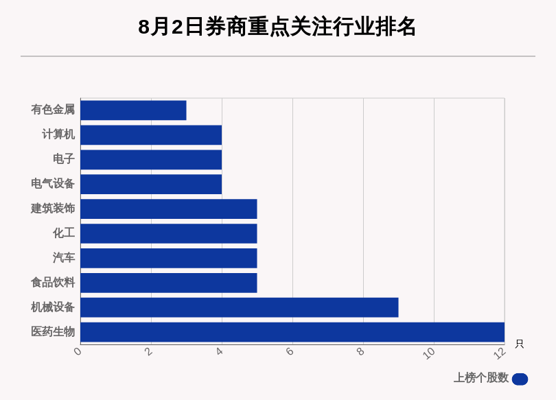 从券商对行业的关注度来看,券商关注个股数居前的行业分别是医药生物、机械设备、食品饮料。