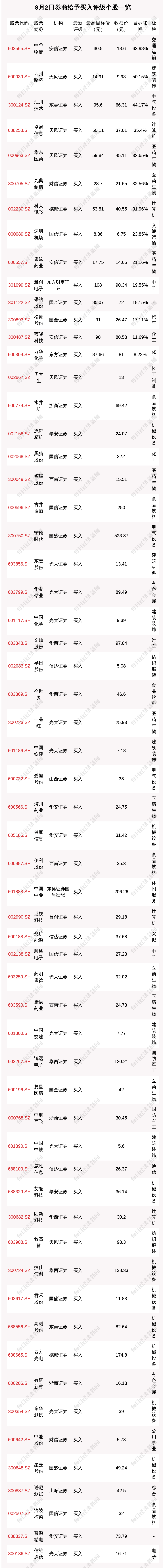8月2日,券商给予评级的个股数共有81只,获得买入评级的个股数共有60只。在公布了目标价格的14只个股中,按照最新收盘价计算,预期涨幅排名居前的个股是中谷物流(603565.SH)、四川路桥(600039.SH)、汇川技术(300124.SZ),预期涨幅分别是63.98%、50.15%、44.17%。