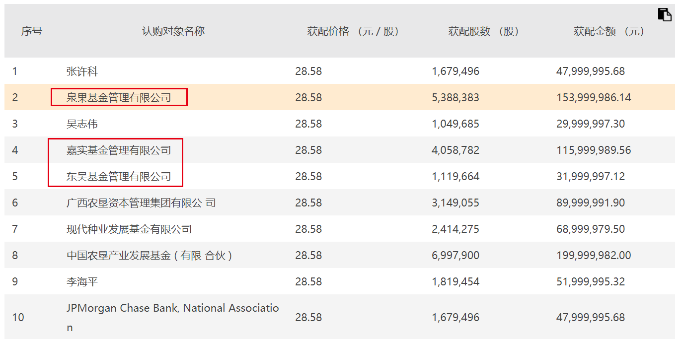 其中,泉果基金本次获配股数为538.84万股,获配金额为1.54亿元;嘉实基金本次获配股数为405.88万股,获配金额为1.16亿元;东吴基金获配股数为111.97万股,获配金额为3200万元。
