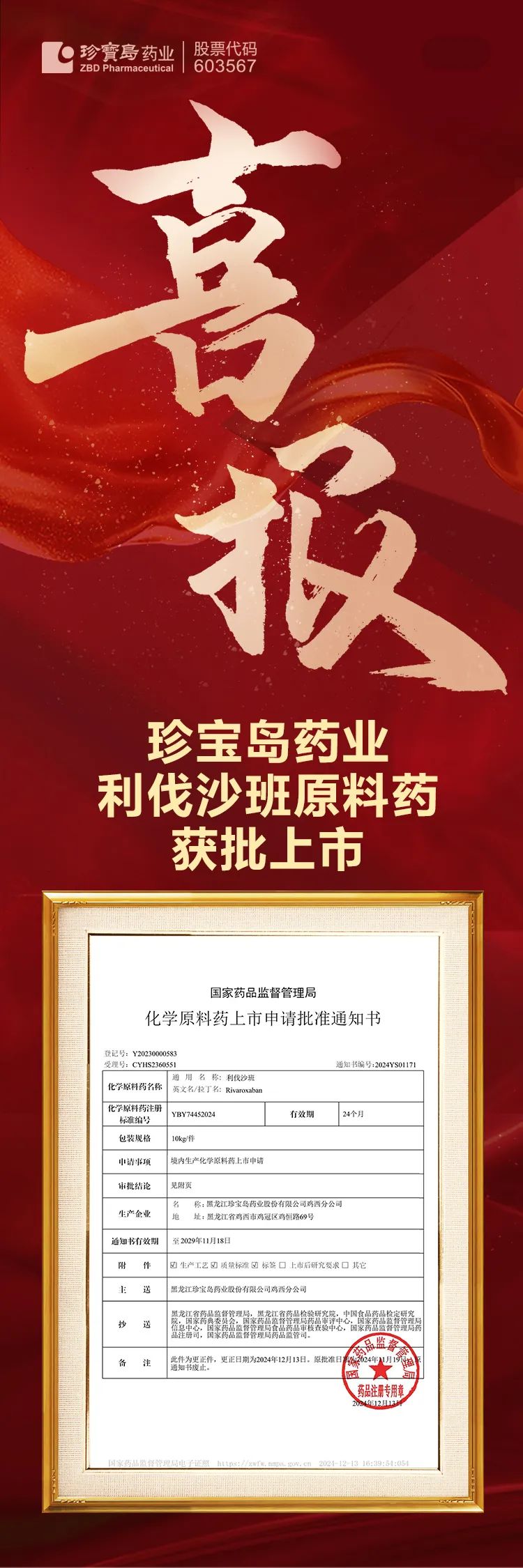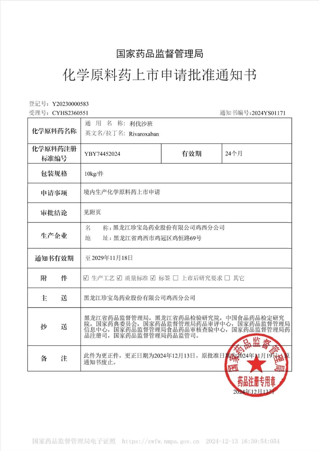 12月16日晚,珍宝岛药业发布公告,鸡西分公司收到利伐沙班的化学原料药上市申请批准通知书(登记号:Y20230000583)。该原料药在CDE原料药、药用辅料和药包材登记信息公示平台上“与制剂共同审评审批结果”由“I”转“A”(已批准在上市制剂使用的原料)。标志公司在符合药品生产质量管理规范要求的前提下可开展上述品种的生产及销售。