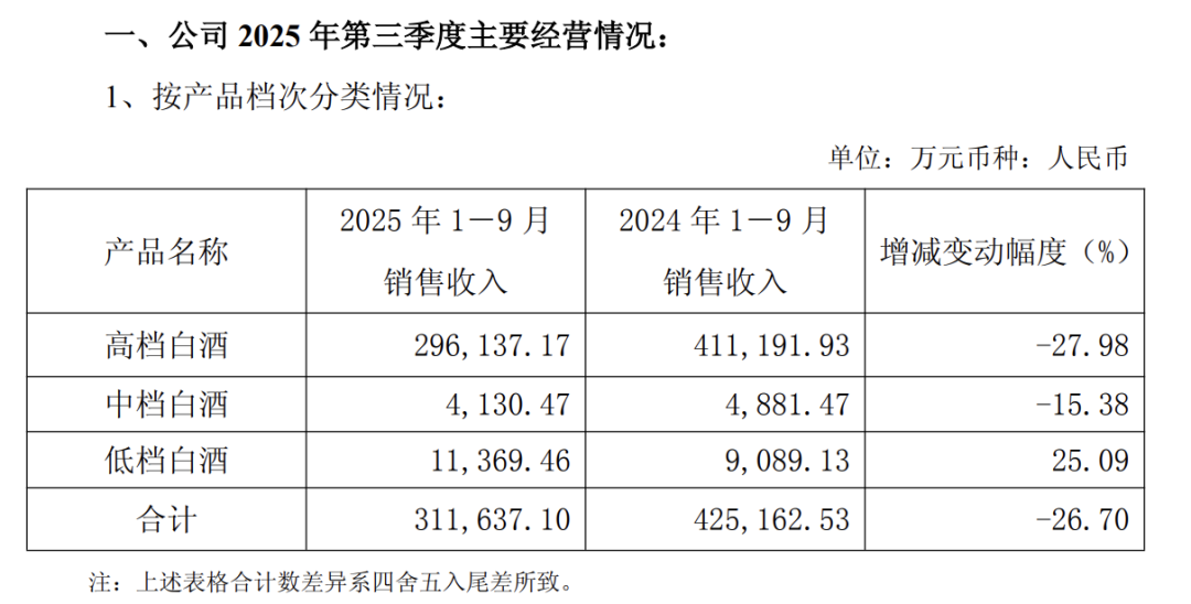 数据显示,按产品档次划分,口子窖2025年前三季度高档白酒销售收入为29.6亿元,占酒类总收入的比重高达95%,但这部分产品收入同比下降27.98%,在所有产品中收入下降最显著;中档白酒前三季度销售收入为0.41亿元,同比下降15.38%;低档白酒前三季度销售收入1.14亿元,同比增加25.09%。