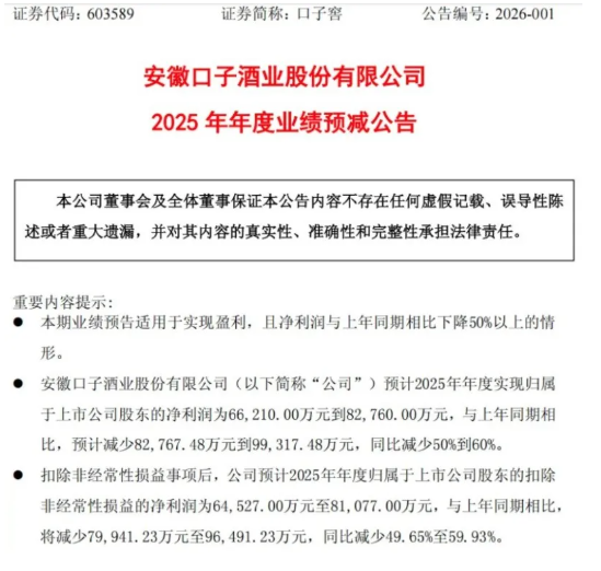 1月7日,兼香型白酒龙头企业口子窖披露2025年度业绩预告。数据显示,2025年全年,口子窖预计实现归母净利润6.62亿元至8.28亿元,同比大幅下滑50%至60%,创下近年来最大业绩跌幅。