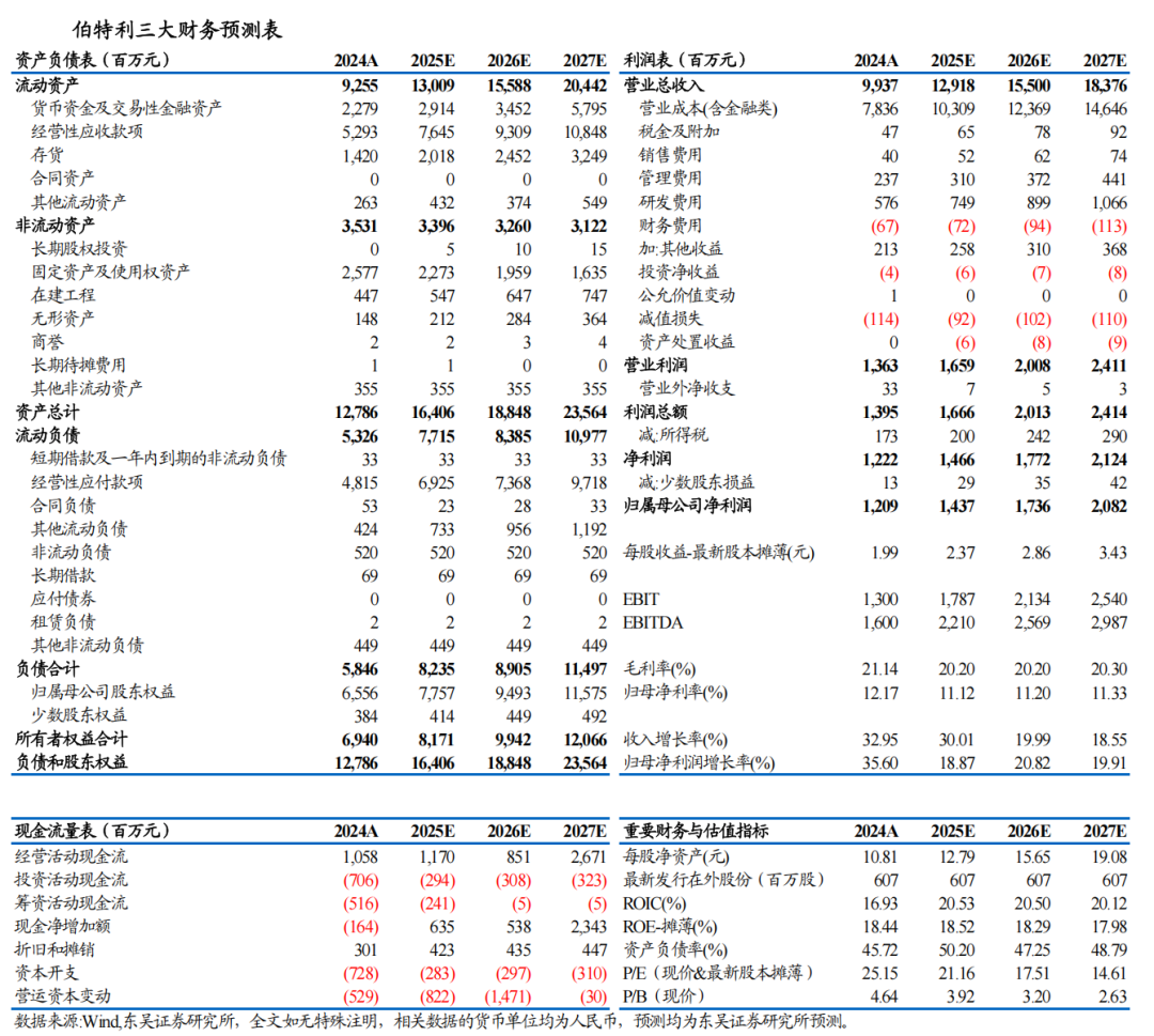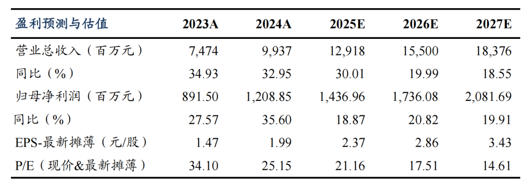 我们维持公司2025-2027年营收为129.2/155.0/183.8亿元,同比分别+30%/+20%/+19%;维持2025-2027年归母净利润为14.4/17.4/20.8亿元,同比分别+19%/+21%/+20%,对应PE分别为21/18/15倍,维持“买入”评级。