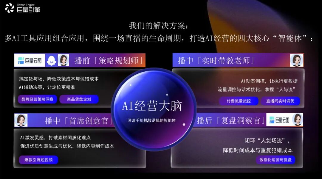 针对痛点,引力传媒提出构建“AI经营大脑”,以巨量云图、扣子空间、豆包AI为核心,打造四大“智能体”: