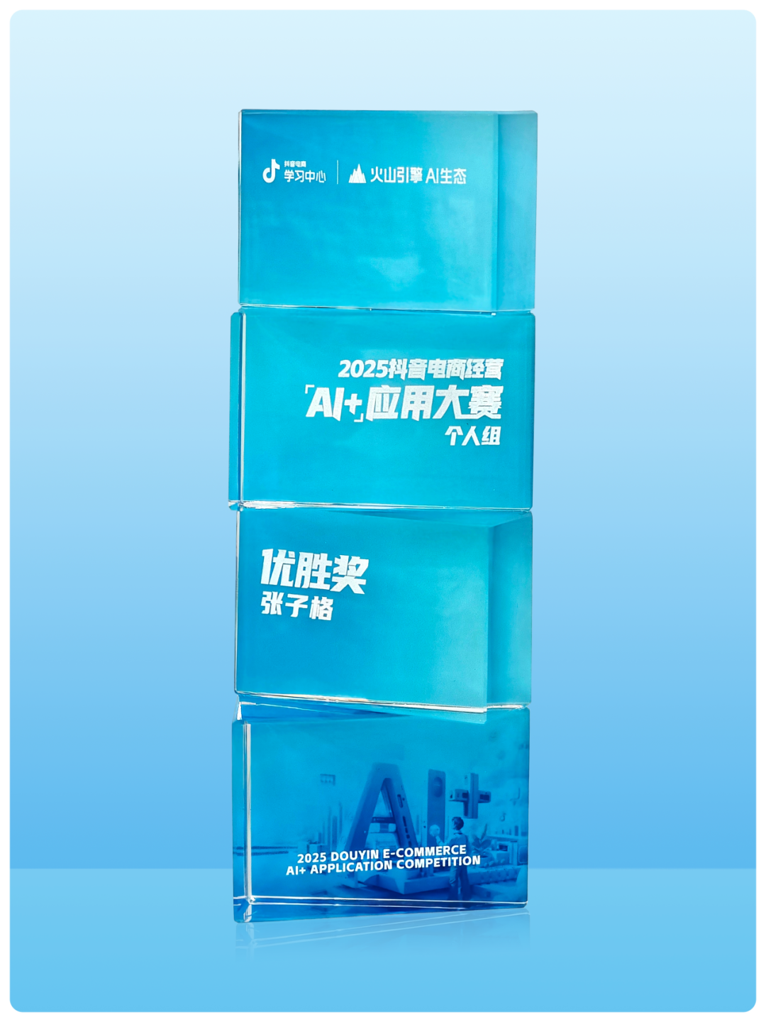 近日,由抖音电商学习中心与火山引擎联合主办的2025抖音电商经营「AI+」应用大赛圆满收官。200多位报名者经过为期1个月时间的激烈比赛,引力传媒电商线效果中心千川总监张子格凭借实战案例分享《AI经营军师实操应用——驱动品牌直播间全域增长新引擎》,在「AI+经营提效」核心赛道表现突出,成功斩获“个人优胜奖”,并获评“抖音电商认证讲师”称号,获官方AI+课程开发、授课等核心权益。这一荣誉既彰显其AI电商领域专业实力,更让引力传媒得以将实战验证的AI经营方法论、平台前沿资源与标准化服务能力同步赋能客户,精准破解流量转化、效率提升等经营痛点,助力客户抢占AI电商发展先机。
