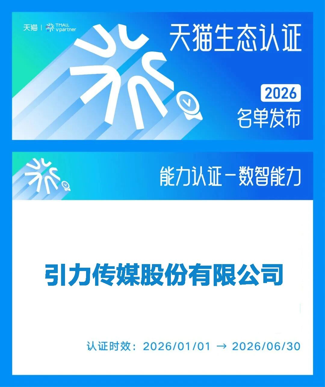 近日,天猫生态正式发布2026年度生态认证名单。引力传媒凭借领先的深度数据分析、洞察与策略验证能力,成功获得天猫生态2026「数智能力认证」。此次认证不仅是对引力数智能力的权威背书,更标志着引力在“数据资产化经营”与“全域增长系统化构建”层面进入行业第一梯队。