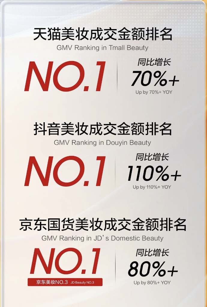 主品牌珀莱雅位列天猫国货美妆第1,天猫美妆第1,平台成交金额同比增长超70%;位列抖音国货美妆第1,抖音美妆第1,平台成交金额同比增长超110%;位列京东国货美妆第1,京东美妆第3,平台成交金额同比增长超80%;位列唯品会国货美妆第1,唯品会美妆第2,平台成交金额同比增长超30%;位列拼多多美妆第1,平台成交金额同比增长超60%。