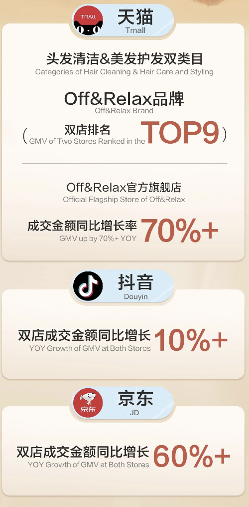 珀莱雅公司旗下亚洲头皮健康养护品牌Off&Relax的OR海外旗舰店、OR官方旗舰店双店的天猫平台成交金额位列头发清洁&美发护发双类目第9,其中OR官方旗舰店的平台成交金额同比增长率超70%;双店的抖音平台成交金额同比增长超10%;双店的京东平台成交金额同比增长超60%;核心产品防脱育发精华液荣登天猫头皮热销榜第2。