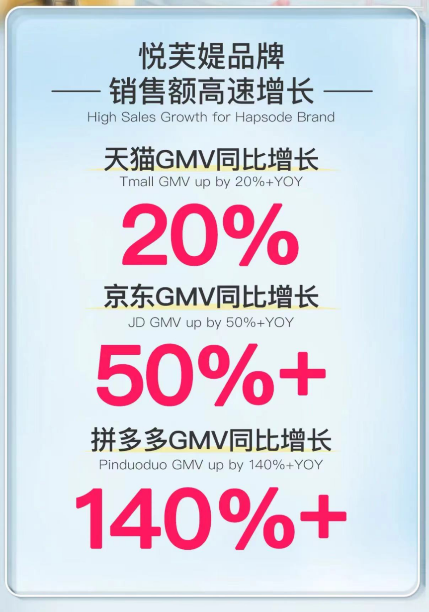 油皮护肤品牌悦芙媞在天猫平台成交金额同比增长超20%,京东成交金额同比增长超50%,拼多多成交金额同比增长超140%。