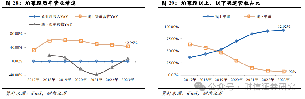 2019年以前,珀莱雅主要以线下日化、商超、单品牌店模式为主。2017-2018年线下日化渠道营收占比超50%。后续随着线上新兴渠道崛起,珀莱雅为抢占先机,开始大力发展线上渠道。2017年,公司将“线上线下结合”的经营战略调整为“线上渠道为主,线下渠道并行”。2019年,珀莱雅品牌线上渠道营收占比首次超过线下,线上渠道营收持续攀升。2023年,公司线上营收占比高达92.92%,成为众多国货品牌中线上营收占比唯一超九成的品牌。据珀莱雅年报显示,2023年,公司线上渠道营收突破80亿元,连续6年保持40%以上增长,珀莱雅品牌逆势崛起。